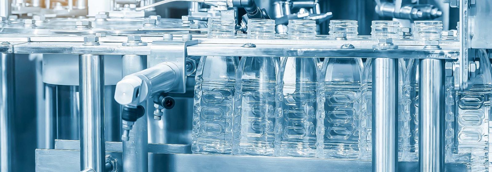 Close up scene of the empty drinking water bottles on the conveyor belt for filling process. The hi-technology of drinking water manufacturing process.